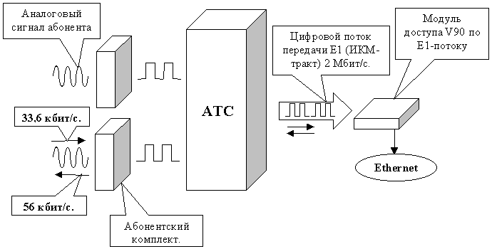 Структурная схема подключения клиентских и серверных модемов использующих протокол v90