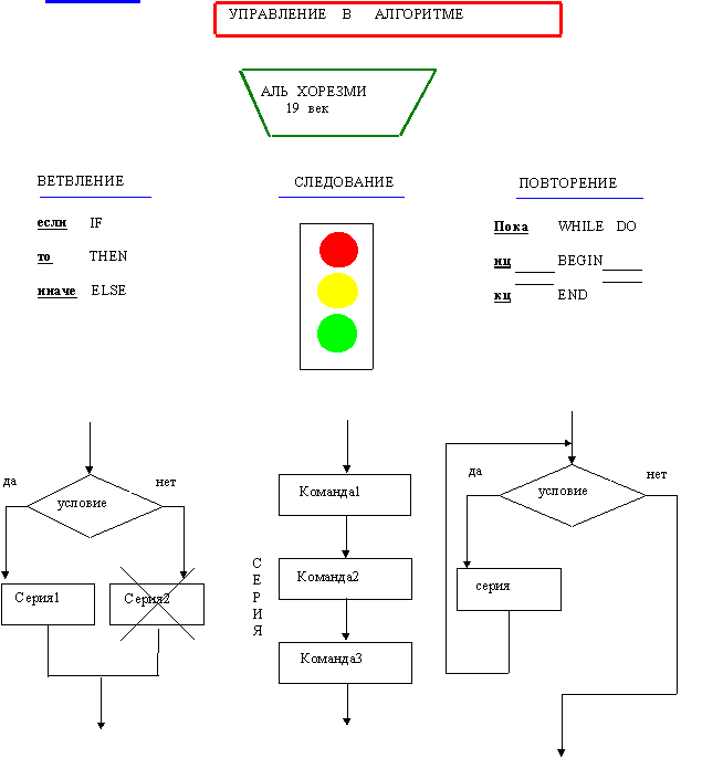 Одна или несколько команд, которые в алгоритме рассматриваются как одно целое и называются серией, изображаются в прямоугольнике с одним входом и одним выходом; условие - в ромбе с одним входом и двумя выходами, над которыми написаны слова “да” и “нет”, означающие выполнение и невыполнение условия соответственно.