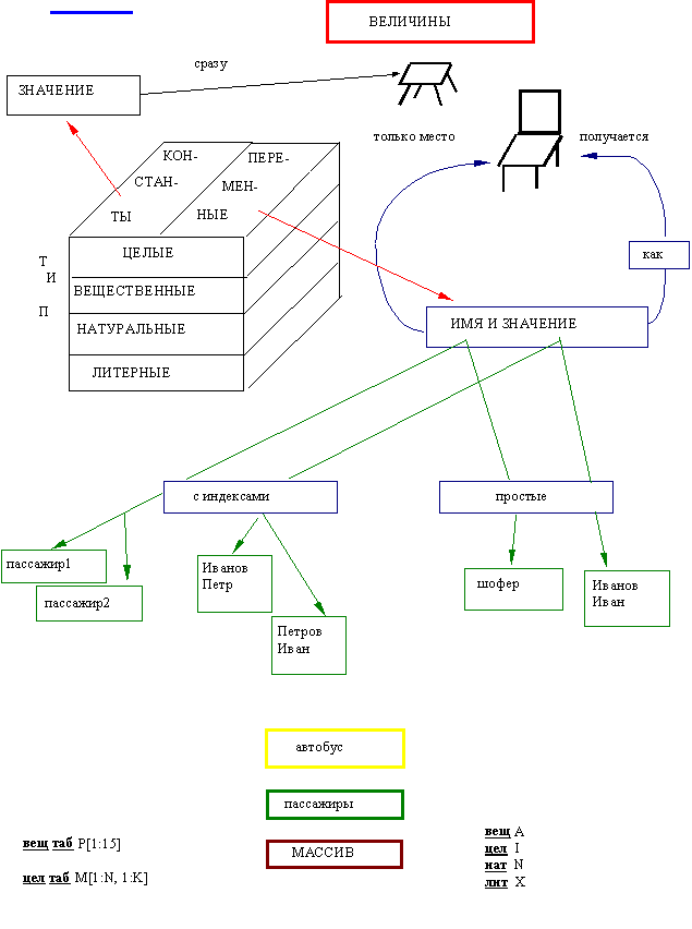 Для пояснения сути этой классификации на ЛОС использован сигнал в виде автобуса. Шофер - это простая величина, являющаяся именем переменной. В автобусе он один. Но на одном автобусе может работать не один шофер. Значит, это имя может иметь разные значения. Автобус перевозит пассажиров. Они образуют массив переменных. Общее имя этого массива - ПАССАЖИР. В автобусе каждый пассажир полностью определяется номером места, которое он занимает. К каждому из них можно обратиться:
