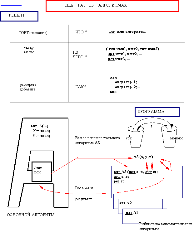Житейским примером, который может быть использован для пояснения способа записи алгоритма, является любой кулинарный рецепт - как приготовить определенное блюдо (что) из определенных продуктов (из чего )? Аналогия полная. Имя алгоритма - это название производимого продукта. Если алгоритм пишется для ЭВМ, то его часто так и называют - программный продукт. Указание типов имен, являющихся аргументами (входами) и результатами (выходами) алгоритма - это задание конкретных характеристик величин, для обработки которых предназначен алгоритм.