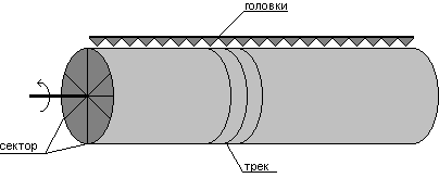 Имеется металлический цилиндр большого веса (вес здесь имеет значение для поддержания стабильной скорости вращения), который вращается вокруг своей оси. Поверхность этого цилиндра покрыта слоем материала, способного хранить информацию (с него можно читать и на него можно записывать информацию). Над поверхностью барабана размещается p считывающих головок. Их положение зафиксировано над поверхностями, которые называются треками (track). Каждый трек разделен на равные части, которые называются секторами. В каждый момент времени в устройстве может работать только одна головка. Запись информации происходит по трекам магнитного барабана, начиная с определенных секторов. Координатами информации служат следующие параметры (№Трека, №Сектора и Объем информации).