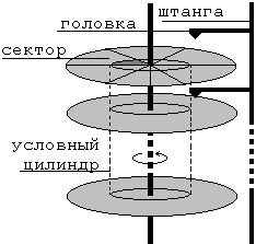 Имеется несколько дисков, размещенных на одной оси, которые вращаются с некоторой постоянной скоростью. Каждый такой диск может иметь две информационно-несущие поверхности (верхнюю и нижнюю), покрытые слоем, способным фиксировать информацию. Диски имеют номера; поверхности каждого диска также пронумерованы (0,1). Концентрическим окружностям одного радиуса на каждом диске соответствует условный цилиндр. Диск также разбит на сектора. Координаты информации на диске (№Диска, №Поверхности, №Цилиндра, №Сектора).