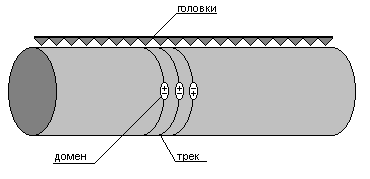 Есть барабан, у которого так же есть треки, и так же над каждым треком расположена головка для обмена, но сам барабан не вращается, а за счет некоторых магнитно-электрических эффектов осуществляется перемещение по треку цепочки доменов. При этом каждый домен однозначно ориентирован, то есть либо он бежит стороной, заряженной “+”, либо стороной, заряженной “-”. Так кодируются ноль и единица. Эта память очень быстродейственна, так как в ней нет никаких механических действий. Эти устройства обычно используются во встроенных вычислительных системах. (Например, она используется в американских ШАТЛах).