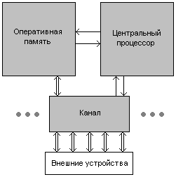 Канал - это специализированная вычислительная машина, имеющая специализированный процессорный элемент и необходимую память. Канал обычно имеет следующую структуру: у него есть высокоскоростной канал связи с оперативной памятью основной машины, управляющие каналы для взаимодействия с ЦП и имеется некоторое количество каналов для подключения внешних устройств.