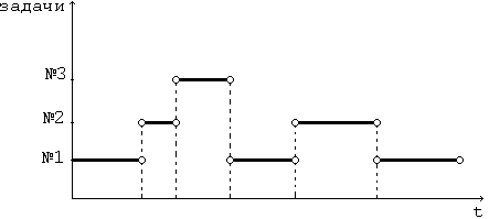 Ось абсцисс связана со временем. На оси ординат отмечены выполняемые задачи. Пусть процессор работает над Задачей №1. В какой-то момент ему потребовались данные, которые находятся на ВЗУ. Формируется заказ на обмен, но данные с устройства еще не поступили (мы знаем, что скорость обмена низка). И какое-то время процессор простаивает. Затем обмен завершился, и программа начала выполняться далее. Затем эта ситуация повторяется (опять простой и т.д.). В зависимости от типа или класса решаемой на этой машине задачи, таких простоев может быть от 99% всего времени до единиц процентов в том случае, если программа долго что-то вычисляет, не обращаясь к внешним устройствам. Но в любом случае эта ситуация приводит к неэффективной работе вычислительной системы, поэтому было бы неплохо при наличии асинхронно работающих устройств (то есть тех устройств, которые работают под управлением аппарата прерываний) в промежутки времени, когда одна программа не может выполняться (так как она ожидает данные), запускать другую программу (Задачу №2). Задача №2 будет жить по тем же правилам (то есть в периоды обмена Задачи №2 и Задачи №1 с внешними устройствами будет запускаться третья задача, и так далее).