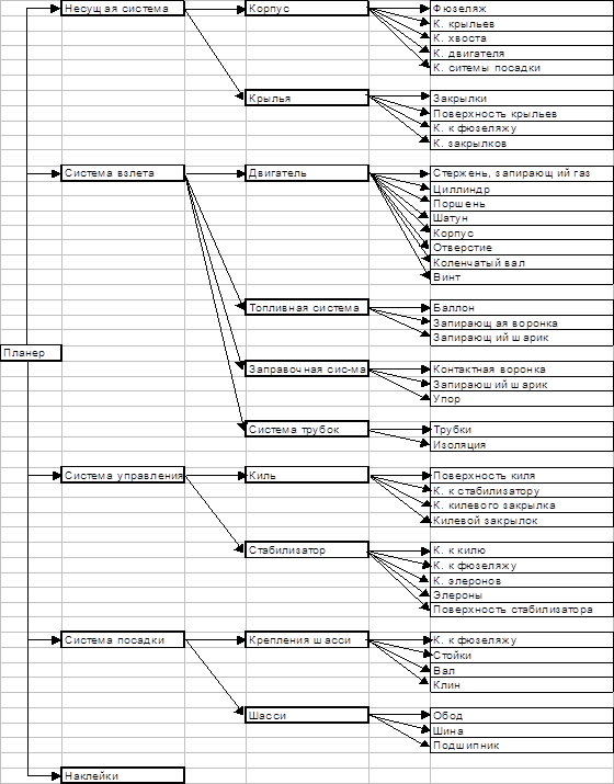 В иерархическом описании я применял сокращение "К." - то есть крепление и, хотя крепление состоит из нескольких частей, я счел нецелесообразным применение пятого уровня иерархического описания ради описания одного единственного крепления. Я лишь поясню текстом из чего оно состоит: в данной модели самолета каждое крепление представляет собой жесткую один пластиковый стержень, который пронизывает соединяемую деталь, и соединяется с другим соответствующим стержнем на другой детали посредством замкнутого резинового шнура. Исключение составляет двигатель и крепления шасси, которые крепятся к пластиковому носу и пластиковому дну фюзеляжа при помощи винтов и крепления закрылков, элеронов и.т.п., которые насаживаются на пластиковый стержень, в свою очередь крепящийся в вырезе крыла в форме закрылка.