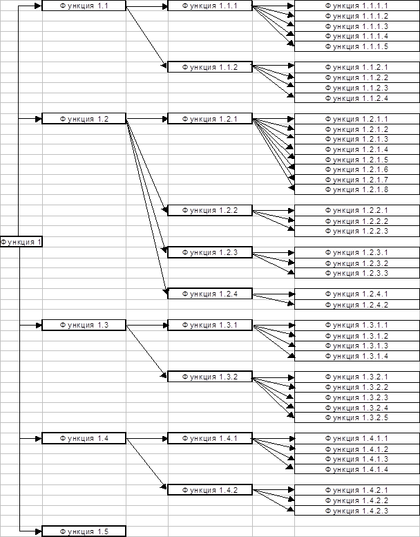 На этом описание функций элементов системы можно считать законченным. Суммарное количество функций таково: функций первого уровня - 1, подфункций второго уровня - 5, подподфункций третьего уровня - 10, подподподфункций четвертого уровня - 41. Теперь перейдем к иерархической структуре функций (смотри на следующей странице).