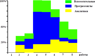 Трудоемкость работ предпроектной стадии: от 15 чел./дней до 150 чел./дней. Чаще всего 30-50. Это означает, что на один комплекс задач выделяется 1-2 человека.