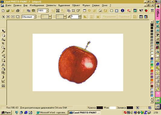 5. Щелкните инструмент «Произвольная маска» (третья кнопка слева на функциональной панели). Поскольку яблоко имеет неправильную форму, придется воспользоваться именно этим инструментом, обеспечивающим максимальную гибкость определения границы маски. Обратите внимание, что значок инструмента «Произвольная маска» заменил на панели графики значок инструмента «Прямоугольная маска», а при перемещении указателя мыши в окно документа он принял форму перекрестья со значком инструмента «Произвольная маска» в правом верхнем квадранте.