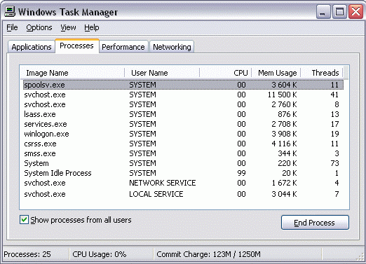Ну и наконец последнее: в реальности пользователь имеет дело не с одним, не с двумя, и даже не с тремя процессами. На приведенном коллаже (это действительно коллаж, потому что со скриншота Task Manager были удалены все пользовательские процессы, т. е. приложения, запускаемые “для работы”) хорошо видно, что “голая” Windows XP, сама по себе, не запустив еще ни одного приложения, уже породила 12 процессов, причем многие из них к тому же еще и многопоточные, и общее количество потоков достигает двухсот восьми штук!