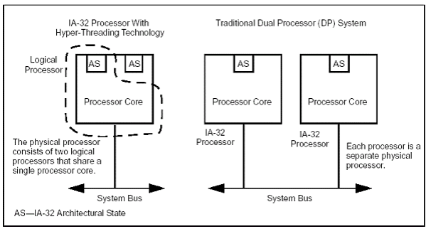 Классическому “одноядерному” процессору добавили еще один блок AS — IA-32 Architectural State. Architectural State содержит состояние регистров (общего назначения, управляющих, APIC, служебных). Фактически, AS#1 плюс единственное физическое ядро (блоки предсказания ветвлений, ALU, FPU, SIMD-блоки и пр.) представляет из себя один логический процессор (LP1), а AS#2 плюс все то же физическое ядро — второй логический процессор (LP2). У каждого LP есть свой собственный контроллер прерываний (APIC — Advanced Programmable Interrupt Controller) и набор регистров. Для корректного использования регистров двумя LP существует специальная таблица — RAT (Register Alias Table), согласно данным в которой можно установить соответствие между регистрами общего назначения физического CPU. RAT у каждого LP своя. В результате получается схема, при которой на одном и том же ядре могут свободно выполняться два независимых фрагмента кода т. е. де-факто — многопроцессорную систему!