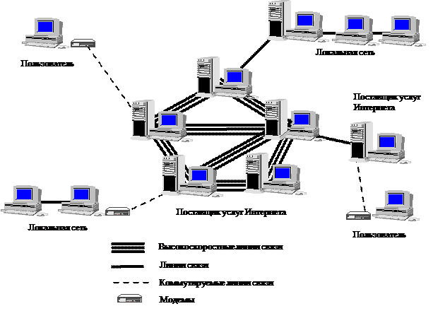 На рис. 1 представлена схема строения сети Internet. В ее основе заложен хребет – суперкомпьютеры, соединенные между собой высокоскоростными узлами связи. В дальнейшем по постоянной линии связи информация передается провайдерам – поставщикам Internet обычным пользователям. Обычно пользователи получают доступ к сети Internet посредством телефонной линии. Однако уже сегодня многие провайдеры предлагают услуги RadioInternet – связь между пользователем и провайдером, информация в которой передается посредством спутниковых каналов связи. Это позволяет существенно увеличить скорость и надежность связи, однако на порядок увеличит стоимость услуги.