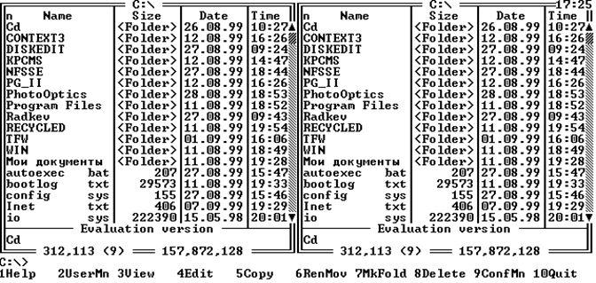3. Вид экрана и панелей. После запуска Norton Commander на экране появляются два прямоугольных окна (панели).