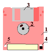 Дискета Защитный корпус. Фланец привода диска. Защитная шторка. Отверстие запрета записи. Отверстие -- признак дискеты высокой плотности |