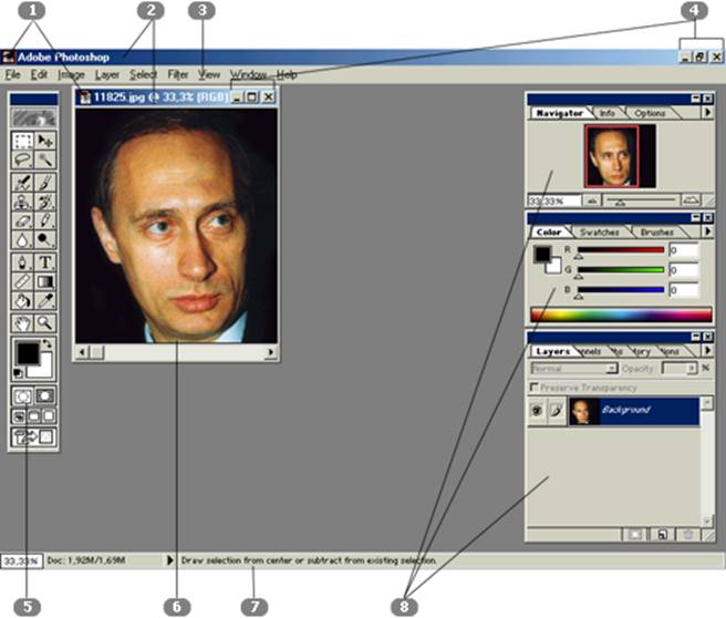 В этом разделе мы рассмотрим пользовательский интерфейс графической программы Adobe Photoshop. На рис.1 представлено окно программы при загрузке в нее графического документа с растровым изображением. Как и в любой другой графической или издательской программе, работающей в операционной среде Windows, здесь имеется стандартный набор элементов, характерных для данной операционной системы. Это – системные меню программы и документа, заголовки программы и документа, строка состояния и основное меню программы, а также системные кнопки Свернуть, Восстановить/Развернуть и Закрыть.