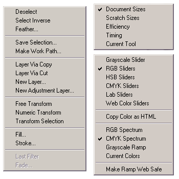 Контекстное меню – это группа команд, имеющих отношение к определенному элементу интерфейса или выполняемой в данный момент операции. Такое меню можно открыть двумя способами: щелчком правой кнопки мыши при установке указателя в каком-либо месте рабочего окна документа или палитры либо щелчком левой кнопки, если указатель установлен на специальной кнопке с треугольной меткой. На рис.2 показаны три контекстных меню. Слева изображено меню операции выделения, а справа – строки состояния (вверху) и палитры Color (Синтез) (внизу).
