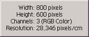 Если установить указатель в строке меню слева от черного треугольника и нажать кнопку мыши, то через некоторое время на экране появится дополнительное окно, где продемонстрировано реальное соотношение размеров изображения и страницы. Если эту процедуру выполнить при нажатой клавише [Alt], то на экране появятся основные сведения об обрабатываемом изображении: Width – ширина изображения, Height – высота, Channels – число каналов, Resolution – разрешение (рис.3).
