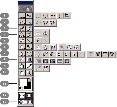 В каждой ячейке основной панели находится один инструмент или целая группа. Если инструментов несколько, то в правом нижнем углу ячейки будет изображена небольшая черная метка. Щелкнув на такой ячейке и зафиксировав на некоторое время кнопку мыши в нажатом состоянии, вы раскроете соответствующую дополнительную панель с находящимися в ней инструментами. Для выбора одного из них нужно установить на нем указатель и отпустить кнопку мыши. Данный инструмент будет помещен в ячейку блока и станет активным.