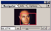 Эта палитра управляет масштабом изображения и перемещением последнего в рабочем окне документа. В центре палитры (рис.5) находится окно навигатора, в котором содержится уменьшенное изображение активного документа. Красной рамкой выделена часть изображения, которая отображается в рабочем окне документа. Переводя указатель внутрь рамки и нажимая кнопку мыши, можно перемещать рамку в палитре, выбирая таким образом фрагмент активного изображения, который должен отображаться в рабочем окне документа.