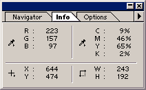 В окне палитры Info (Инфо) вы можете найти информацию о цветовых параметрах пикселя (группы пикселей) изображения, на котором установлен указатель мыши. Эта информация обычно рассчитана на цветовые модели RGB и CMYK и располагается в верхней части окна палитры. Для модели CMYK рядом с численными параметрами цвета в большинстве случаев стоит знак процента. Если вместо него вы увидите восклицательный знак, это означает, что цвет данного пикселя не входит в цветовое пространство модели CMYK.