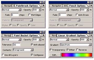 Палитра применяется для настройки параметров рабочих инструментов программы. Текущее название палитры и ее содержимое зависят от того, какой инструмент выбран. На рис.7 показаны четыре облика этой палитры – при работе с инструментами Paintbrush(Кисть), Pencil (Карандаш), Paint Bucket (Заливка) и Linear Gradient (Линейный градиент).