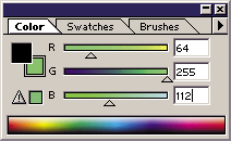Если указанный вами цвет не может быть отображен в цветовом пространстве модели CMYK, то внизу слева появятся заключенный в треугольную рамку восклицательный знак и небольшой квадрат, окрашенный цветом, который близок к заданному, но входит в число цветов, допустимых для данной модели. Щелчок на данном квадрате приводит к замене этим цветом того, который был задан ранее.