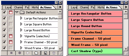 Палитра Actions (Операции) предназначена для автоматизации обработки изображений путем создания и многократного применения сценариев, представляющих собой наборы команд, часто используемых при обработке. На рис.15 изображены два варианта этой палитры: слева – обычный, справа – кнопочный. Последний применяется лишь в режиме воспроизведения сценариев (к его использованию можно перейти с помощью команды Button Mode меню рассматриваемой палитры).