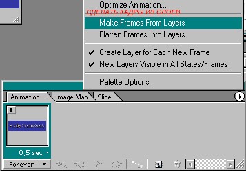 10 . Для этого обратимся к окну "анимация". В меню этого окна выберем команду "сделать кадры из слоев".