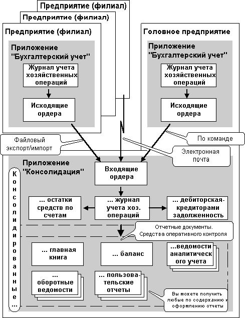 - Высокая трудоемкость сбора и обобщения (консолидации) данных территориально-распределенных участков, в частности, бухгалтерий, каждая из которых ведет свои, "неполные" с точки зрения корпорации, балансы; большое количество ошибок в подобных данных, их разнородность и несогласованность.