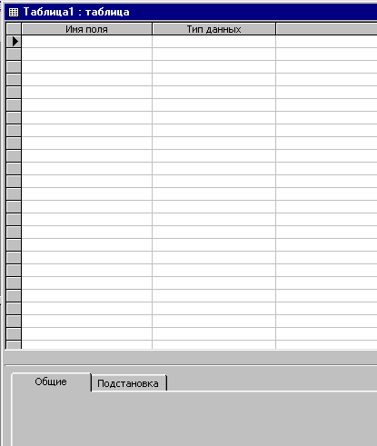 Создадим таблицу, содержащую данные поставщиков и клиентов с помощью конструктора. Для этого сначала выберем вкладку "Таблицы", а затем в окне базы данных сделаем двойной щелчок мыши по листку с подписью "Создание таблицы в режиме конструктора". На экране появиться окно изображенное на рис. 3.