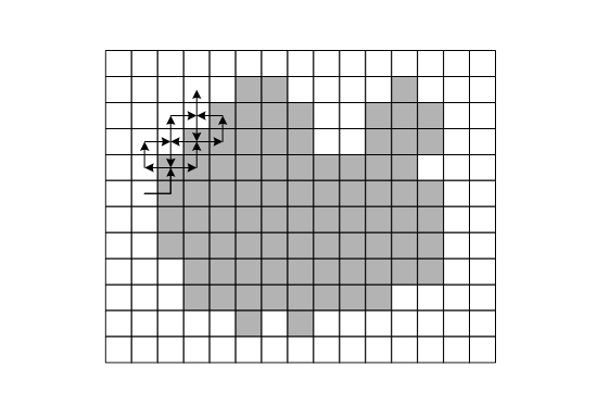 Отслеживающие алгоритмы основаны на том, что на изображении отыскивается объект (первая встретившаяся точка объекта) и контур объекта отслеживается и векторизуется. Достоинством данных алгоритмов является их простота, к недостаткам можно отнести их последовательную реализацию и некоторую сложность при поиске и обработке внутренних контуров. Пример отслеживающего алгоритма - "алгоритма жука" - приведен на рис. 5.12. Жук начинает движение с белой области по направлению к черной, Как только он попадает на черный элемент, он поворачивает налево и переходит к следующему элементу. Если этот элемент белый, то жук поворачивается направо, иначе - налево. Процедура повторяется до тех пор, пока жук не вернется в исходную точку. Координаты точек перехода с черного на белое и с белого на черное и описывают границу объекта.