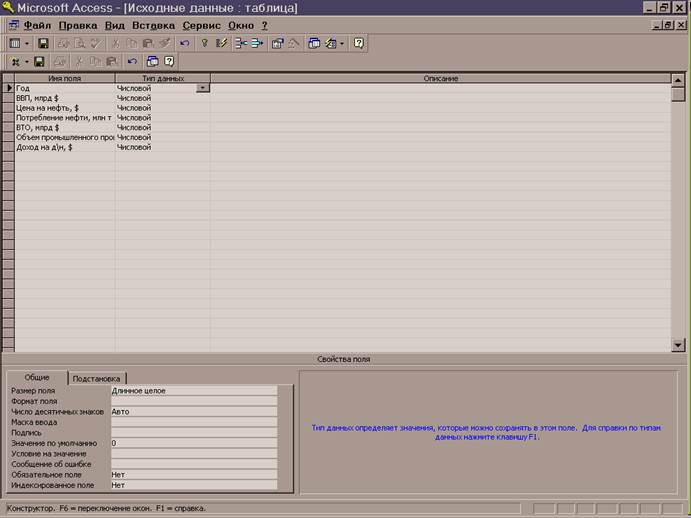 Имеются данные по Японии за период с 1960 по 1992 года, представляющие собой сводную таблицу в Microsoft Access . Данные взяты из статистических справочников. Для занесения данных в Microsoft Access необходимо создать новую базу данных, затем таблицу в ней и последовательно ввести все имеющиеся данные по Японии в режиме конструктора (рис.1), заполняя строки с именами полей и типом соответствующих данных. Имена полей в данном случае – название экономических показателей за 32-летний период, а так как все данные числовые, то это будет отражено в соответствующих строках с типом данных. По завершении формирования макета исходной таблицы, необходимо открыть получившуюся таблицу и ввести все имеющиеся данные за каждый год в соответствующие графы таблицы (рис.2).