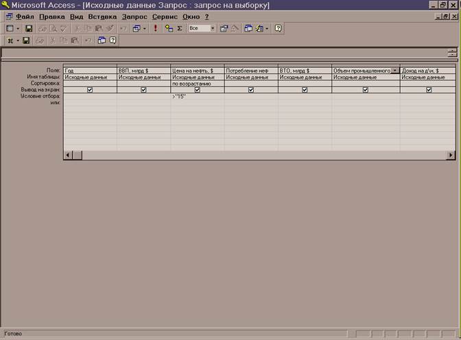 После создания таблицы в Microsoft Access необходимо разработать запрос для нахождения данных в зависимости от цены на нефть. Для этого надо создать запрос и в режиме конструктора (рис.3) ввести необходимые поля, а также имя таблицы, данные из которой используются в запросе, затем ввести условие сортировки, если это необходимо (по возрастанию, по убыванию) и условие отбора данных из исходной таблицы.