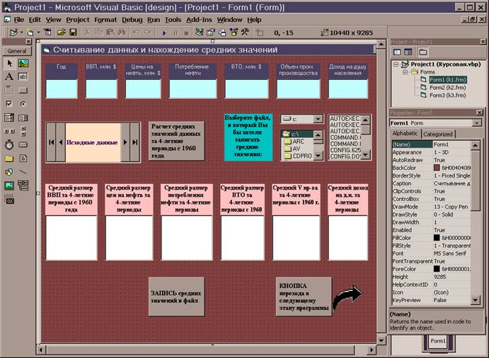 В Visual Basic начинаем новый проект, выбирая в меню New File пункт New Project . Выделяем первую форму и в окне Properties в графе Caption устанавливаем для первой формы название ‘ Считывание данных и нахождение средних значений ’ , при этом имя первой формы – Form1 .