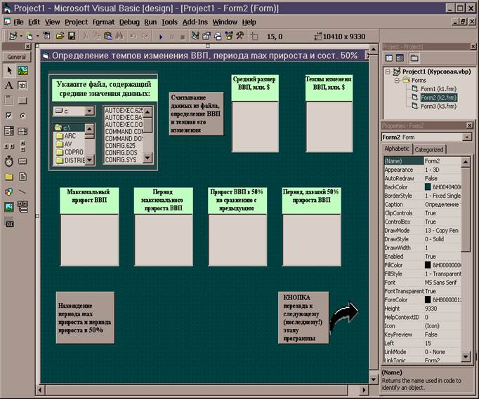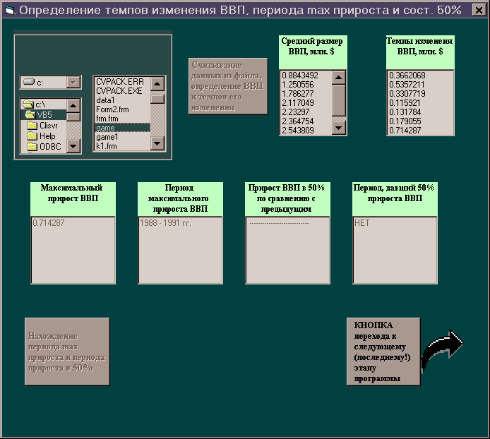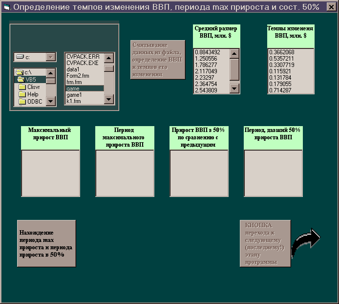 Разработать форму и программу в Visual Basic, позволяющую считывать этот файл, вычислять размер ВВП, темпы его изменения и находить период максимального прироста и периоды, дающие 50% прироста.