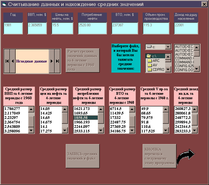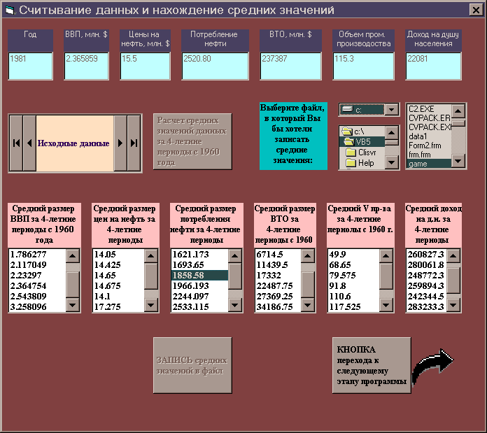 Разработать форму и программу в Visual Basic, позволяющую считывать эти записи, вычислять средние значения за 4-летние периоды и заносить эти средние значения в файл.