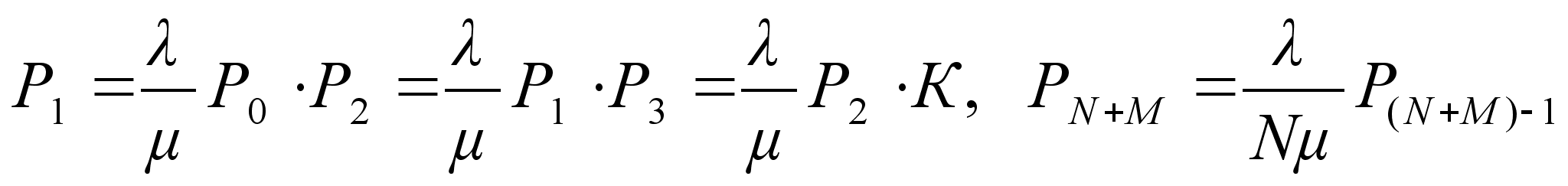 3 Одноканальная система массового обслуживания с накопителем, многоканальная система массового обслуживания с накопителем. Рассмотрим общую схему системы массового обслуживания для разомкнутых смешанных систем. Она состоит из обслуживающей и обслуживаемой систем. Обслуживаемая система включает совокупность источников требований и водящего потока требований. Требование -каждый отдельный запрос на выполнение какой-либо работы (на производство услуги). Источник требования - объект (человек, механизм и т.д.), который может послать в обслуживающую систему одновременно только одно требование Обслуживающая система состоит из накопителя и механизма обслуживания. Обслуживанием считается удовлетворение поступившего запроса на выполнение услуги. Механизм обслуживания состоит из нескольких обслуживаюших аппаратов. Обслуживающий аппарат - это часть механизма обслуживания. которая способна удовлетворить одновременно только одно требование (ремонтный рабочий или бригада, кран, экскаватор, пост мойки и т.д.). После окончания обслуживания требования покидают систему, образуя выходящей поток требований. Для моделирования СМОРС должны быть известны четыре ее параметра λ - плотность входящего потока, показывающая среднее число требований, поступающих в СМО в час (параметр загрузки). Поток заявок простейший. μ -среднее число заявок обслуживаемых одним аппаратом в час (параметр разгрузки). Распределение интервалов обслуживания подчиняется показательному распределению N - чисто обслуживающих аппаратов. Будем полагать, что аппараты имеют одинаковую производительность обслуживания μ требований/час. М - максимальное число требований, которое может быть размещено в накопителе при ожидании обслуживания. Будем считать, что если очередное требований поступающее в СМО в состоянии, когда буду т заняты все аппараты и все места в накопителе то требовании получает отказ в обслуживании и покидает систему массового обслуживания не обслуженным. В системе массового обслуживания постоянно протекают два случайные процесса: - процесс загрузки обуотовтенный параметром λ - процесс разгрузки обуотовтенный параметром μ В результате чего СМО меняет свои состояния Для расчета вероятностей состояний используется формула связывающая вероятности двух соседних состояний из графа состояний по следующему правилу: вероятность Рi равна вероятности предыдущего состояния Рi-1 умноженной на отношение показателя загрузки к показателю разгрузки Si-1 состояния.