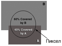 Для реализации краевого антиалиасинга чаще всего используют технику усреднения по площади (area averaging). Цвет пиксела определяется на основании того, насколько каждый полигон перекрывает данный пиксел. Например, как показано на рисунке ниже, пиксел перекрывают два полигона: A и B. Метод усреднения по площади определяет видимые области, занимаемые полигонами, которые "прикасаются" к пикселу, и вычисляет результирующий цвет на основании видимых площадей перекрытия (то есть принадлежащих и пикселу, и полигону). Пусть полигон A занимает 40% площади пиксела, а полигон B – 60%. Результирующий цвет в этом случае определяется цветами A и B c весовыми коэффициентами 40% и 60% соответственно (то есть проводится операция альфа-смешения). Для линий и точек метод тот же самый, в данном случае считается, что линии и точки имеют ненулевую площадь.
