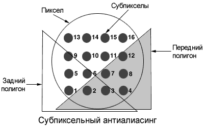 В 3D-ускорителях серии Glint от 3DLabs используется другой метод, основанный на хранении маски. Рассмотрим случай, когда 1 пиксел разбивается на 16 (4x4) субпикселов (эта техника называется мультисэмплингом), а полигоны рендерятся front-to-back (картинка снизу).