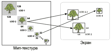 Мипмэппинг (MIP-mapping) использует несколько версий одной текстуры с разной степенью детализации (LOD – level-of-detail), причем следующая версия меньше предыдущей в 4 раза (например 128x128, 64x64, 32x32 и т.д.). Такие версии называются мип-уровнями, а все версии одной текстуры – мип-каскадом.