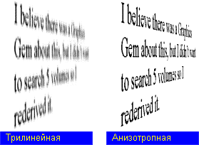 Трилинейная фильтрация (tri-linear filtering). Наиболее аккуратный способ вычисления цвета пиксела. Трилинейная фильтрация более сложна, нежели предыдущие методы. В отличие от простого мипмэппинга, в котором просто выбирается подходящий уровени детализации, здесь проводится интерполяция между двумя соседними мип-уровнями. Благодаря этому полосы мипмэппинга не образуются. При вычислении цвета пиксела используется 8 текселов (4 при билинейной фильтрации) и требует 7 операций смешения (3 при билинейной фильтрации). Использование трилинейной фильтрации дает гораздо более высокое качество изображения для движущихся объектов.