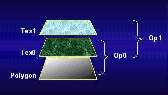 Мультитекстурирование – метод рендеринга с использованием нескольких текстур за минимальное число проходов. Текстуры накладываются на объект последовательно, с использованием разного рода арифметических операций. Мультитекстурирование позволяет конвейеризировать наложение текстур с использованием нескольких (обычно двух) блоков текстурирования. Рисунок наглядно демонстрирует выполняемые действия. Первый блок накладывает на пиксел текстуру Tex0, используя операцию Op0, передает пиксел второму блоку. Этот пиксел передается второму блоку, который натягивает на него текстуру Tex1, используя операцию Op1. В это время первый блок не ждет, а переходит к обработке следующего пиксела, и т.д. Мультитекстурирование похоже на конвейеризацию в микропроцессорах, только мультитекстурирование гораздо проще, здесь нет никаких ветвлений и т.п. Операции наложения тумана и альфа-смешения с фрейм-буфером не относятся к мультитекстурированию и выполняются после всех стадий.