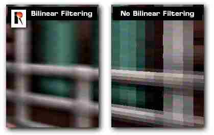 Билинейная фильтрация (bi-linear filtering) использует 4 смежных тексела для получения одного пиксела (рисунок ниже). Билинейная фильтрация требует четыре операции смешения для каждого результирующего пиксела: для двух верхних текселей, для двух нижних и для двух полученных значений.