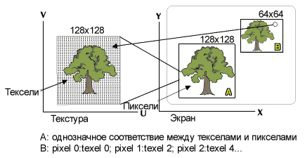 | Пикселизация | Pixelization | образование "квадратов" при сильном растягивании текстуры и отсутствии билинейной фильтрации |