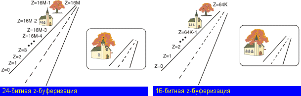 Главный аттрибут z-буфера – разрещающая способность. Она критична для высококачественного рендеринга сцен с большой глубиной. Чем выше разрешающая способность, тем выше дискретность z-координат и точнее выполняется рендеринг удаленных объектов. 24-разрядный z-буфер дает разрешающую способность 16 млн, 32-разрядный – 2 млрд, а 16-разрядный – только 64 тыс. Если при рендеринге разрешающей способности не хватает, то может случиться, что 2 перекрывающихся объекта получат одну и ту же z-координату, в результате аппаратура не будет знать какой объект ближе к наблюдателю, что опять же ведет к z-алиасингу.