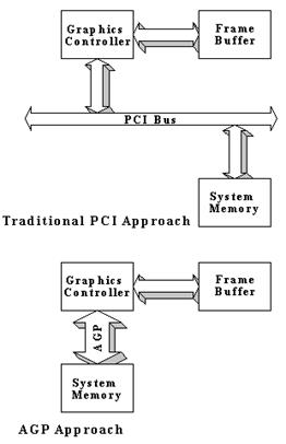 Разработчики PC имели ранее возможность использовать системную память для хранения информации о текстурах и z-буфера, но ограничением в этом подходе была передача такой информации через шину PCI. Производительность графической подсистемы и системной памяти ограничиваются физическими характеристиками шины PCI. Кроме того, ширина полосы пропускания PCI, или ее емкость, не достаточна для обработки графики в режиме реального времени. Чтобы решить эти проблемы, Intel разработала AGP.