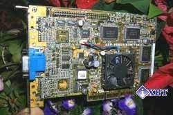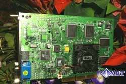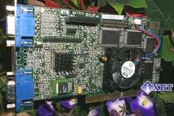 Как можно видеть на фотографии, видеокарта имеет TV-out и места под монтаж цифрового выхода на LCD-мониторы, что соответствует дизайну карты, предложенному NVIDIA. На чипсете имеется активный кулер. Память на плате, хоть и расчитана на 166 МГц, тактуется на 150 МГц (300 МГц в пересчете на обычную SDR-память).