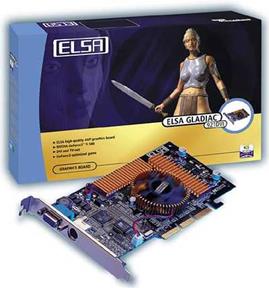 Топ-модель ELSA Gladiac 921 на чипе NVIDIA GeForce3 Ti500 (частота 240 МГц) оборудована 64 Мб 3,8 нс памяти DDR SDRAM (частота 520 МГц). Карта оборудована ТВ-выходом, комплектуется DVD плеером ELSA Movie 2000 DVD и поступит в розницу по цене около $400.
