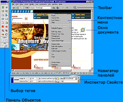 Возможность визуального редактирования в Dreamweaver также позволяет быстро создавать или менять дизайн проекта без написания кода. Dreamweaver относится к так называемым "визуальным" редакторам, т.е. вы сразу можете видеть на экране (хотя бы приблизительно) результат своей работы. При этом он предоставляет полный доступ к источнику кода и не вставляет в него ничего лишнего, как это делает, например, FrontPage. Таким образом, можно создавать свою страничку и параллельно изучать HTML, заглядывая в источник. Можно на живом примере убедиться, что HTML - это просто. Простота обращения с редактором DreamWeaver заключается в том, что возможно рассмотреть все централизованные элементы и перетащить их с удобной панели непосредственно в документ.