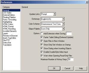 Так выглядит первая закладка в настройках. DreamWeaver имеет очень большое количество различных настроек, настолько большое, что их пришлось разбить на несколько категорий (колонка слева). Но мы затронем те, которые действительно важны в работе, поэтому такие пункты как HTML Colors или Highlightning мы рассматривать не будем.